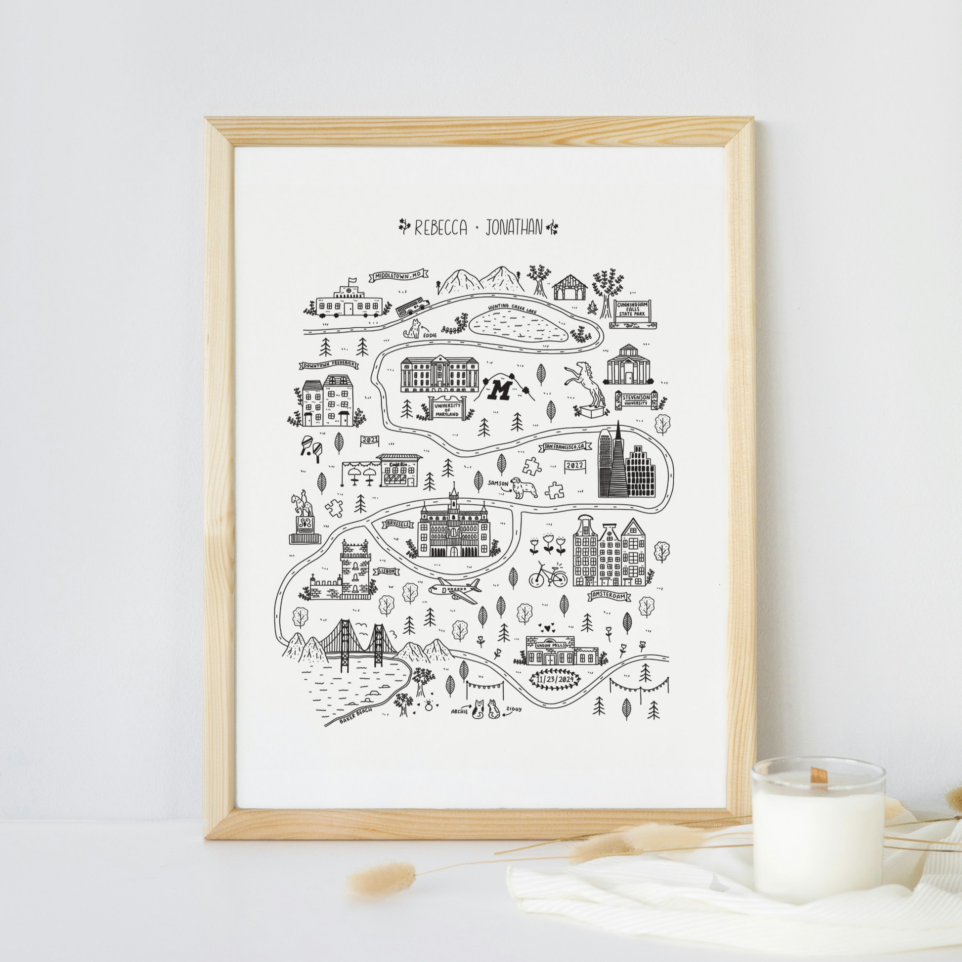 Capture the unique journey of your love story with this Hand-Drawn Custom Couple Map! This personalized piece of art is perfect for celebrating your special moments together. Celebrate your love story with a custom map that tells the tale of your journey together. Whether it's the place you first met, your favorite travel destinations, or where you got married, I work to create a beautiful keepsake that you'll cherish forever (frame NOT included).